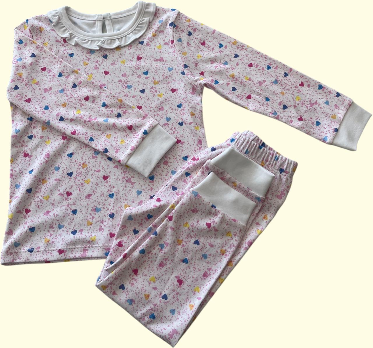 Pijama Blusa e Calça ML - Corações Coloridos Fundo Pontilhado Rosa