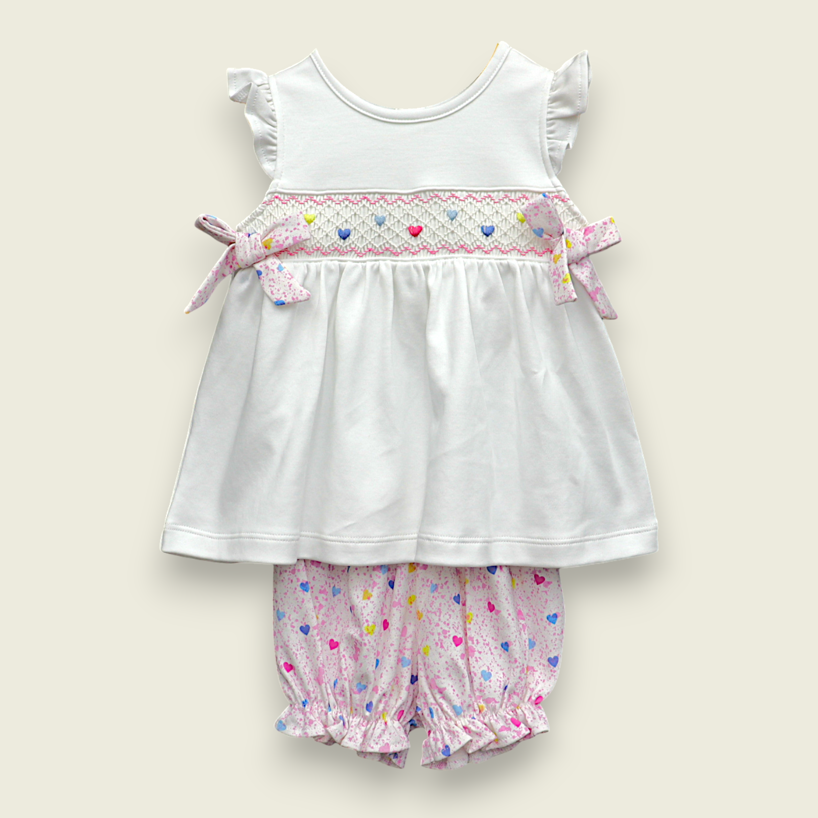 Vestido Laço Smock Corações Coloridos - Branco Liso