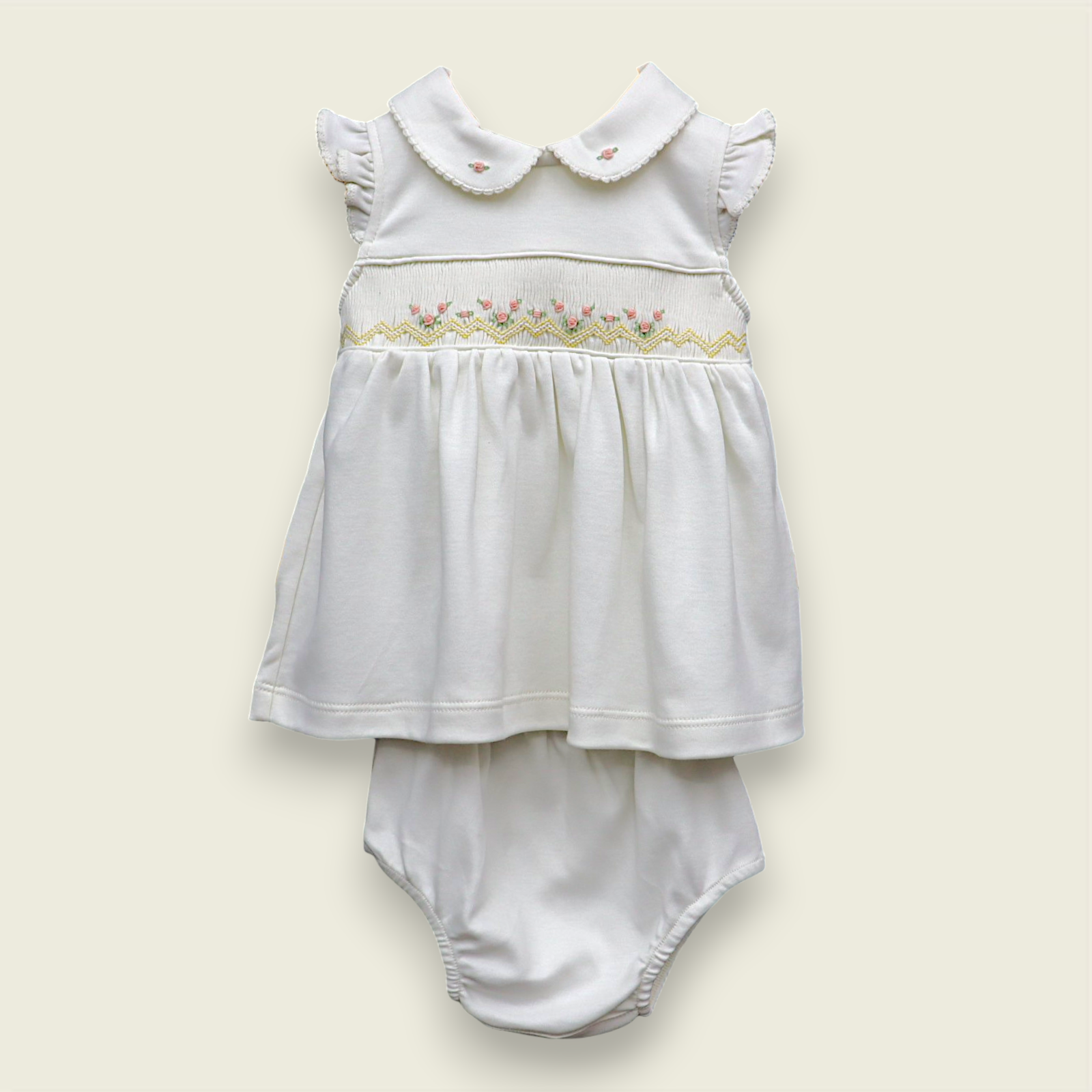 Vestido Smock Florzinhas Linhas Amarelas - Off-White Liso